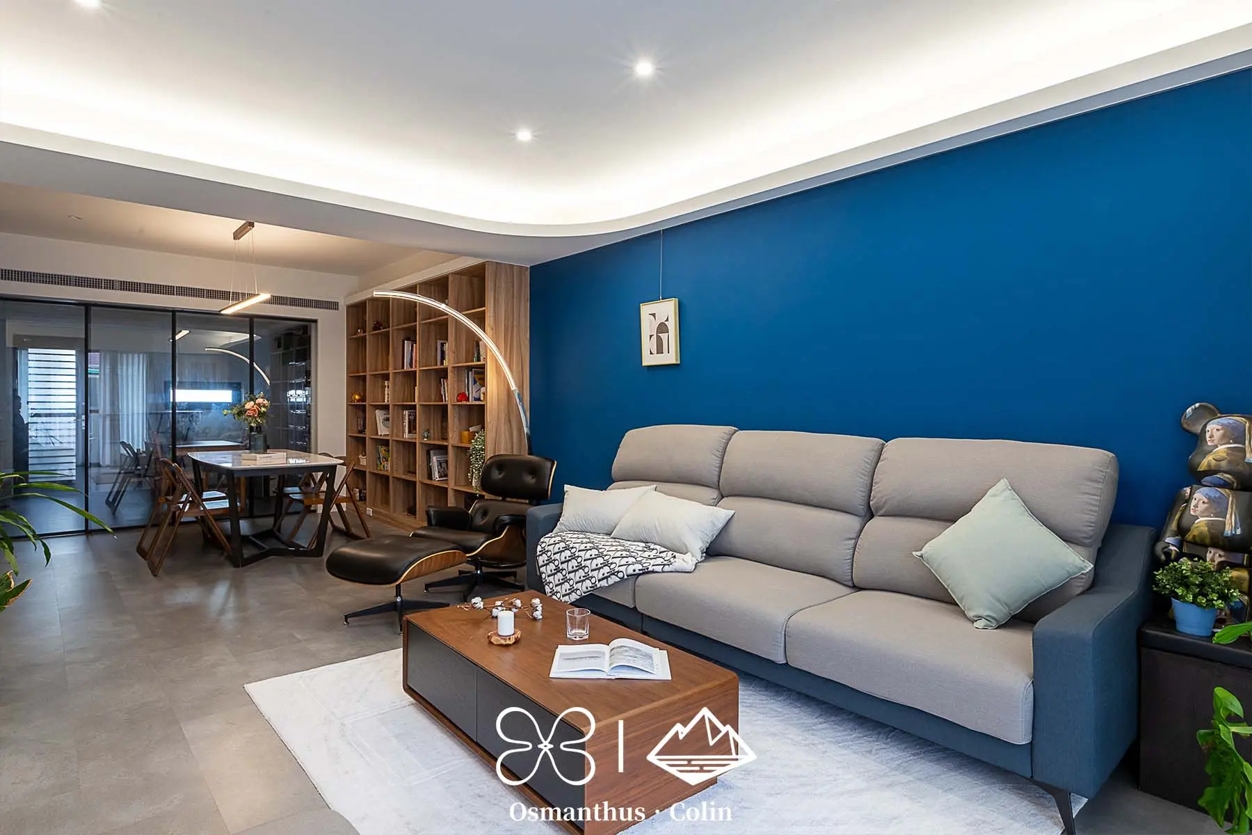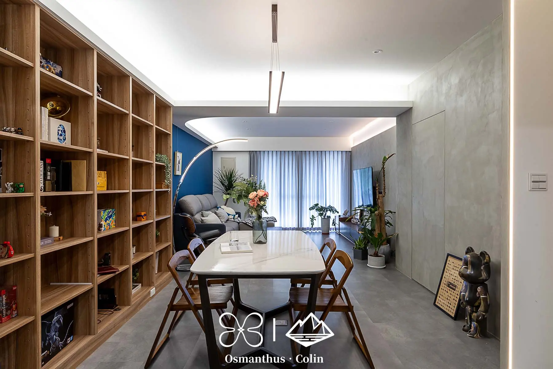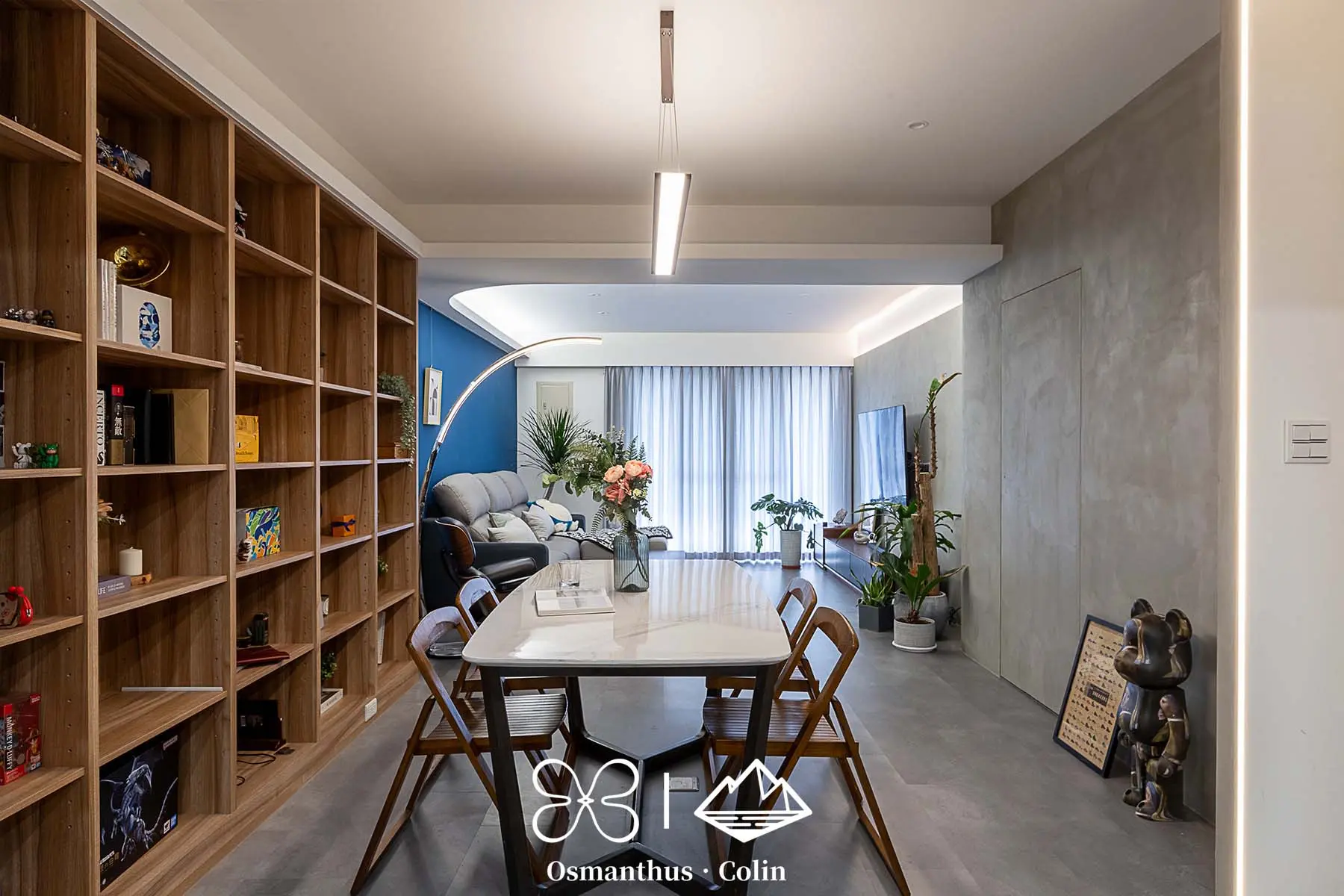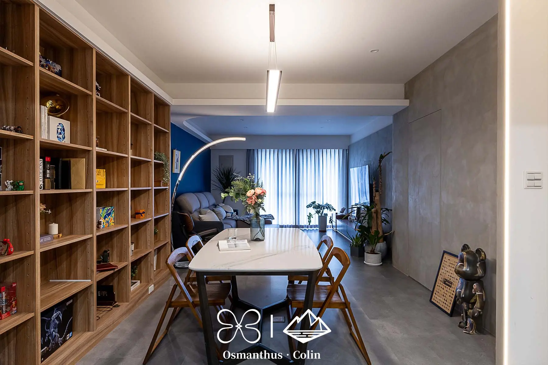 牆面選用樂土塗料,搭配仿水泥質感SPC地板,整體調性內斂而有層次,再以仕紳藍搭配深木色系作為主軸,呼應屋主理性穩重的個性。空間中的垂直燈帶與間接照明不僅勾勒出建築結構,也有引導動線的效果,讓住家多了一種低調的商務感。