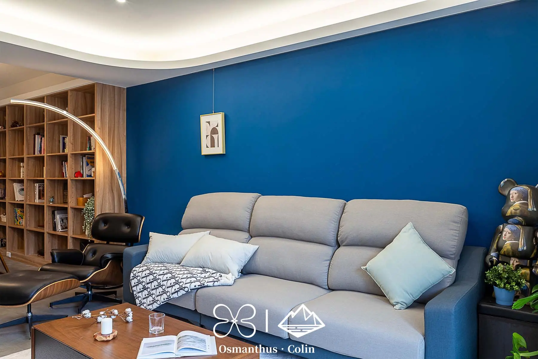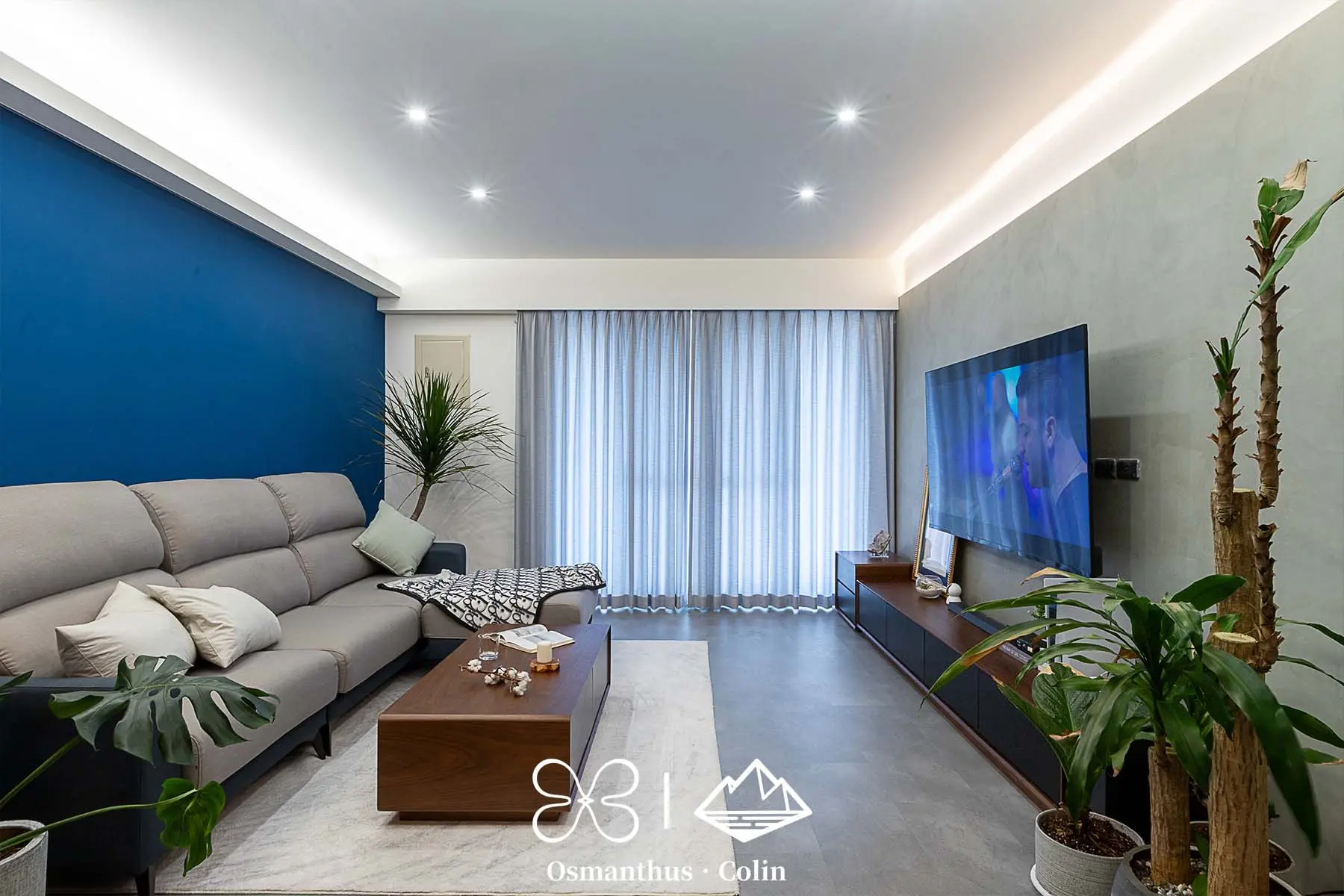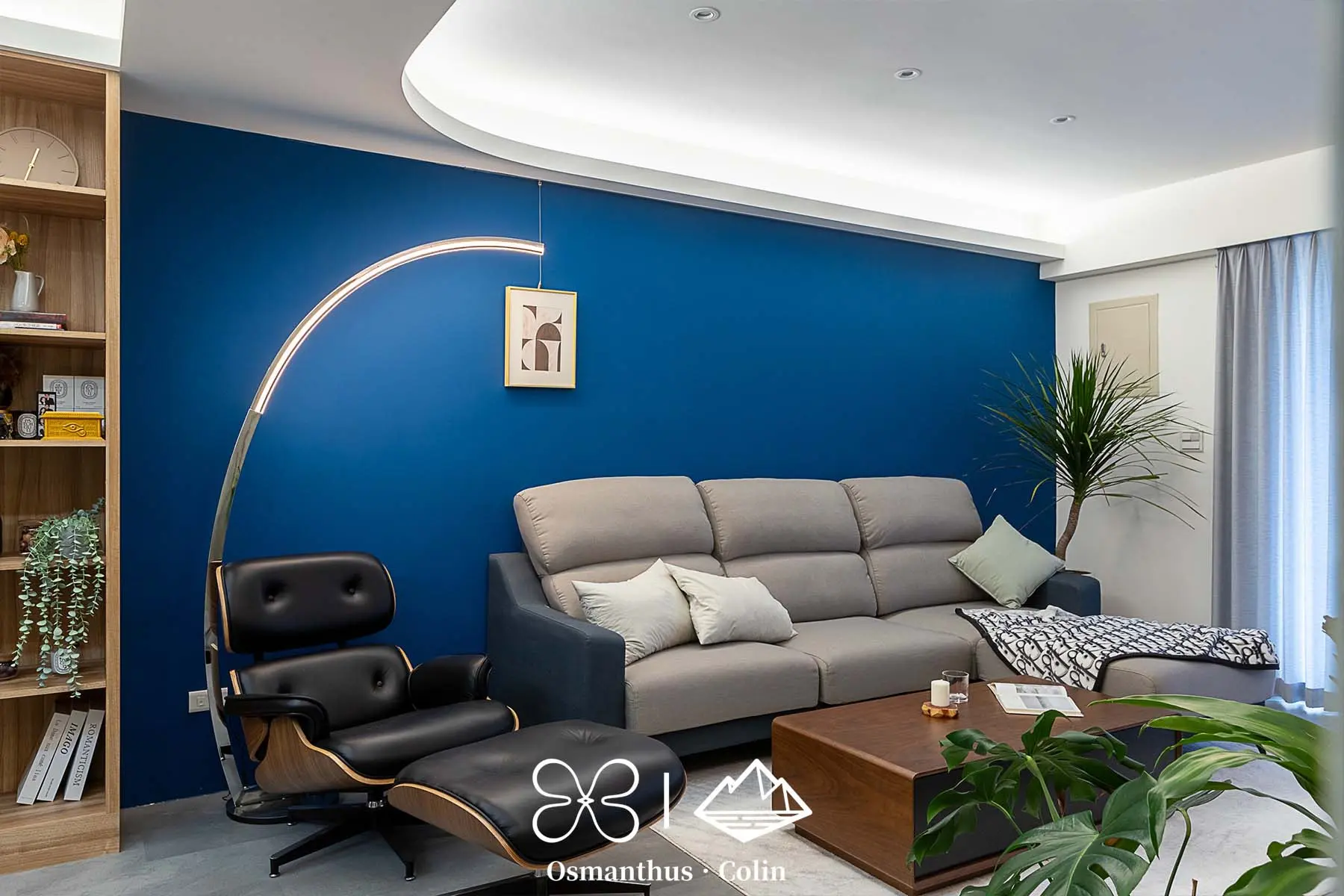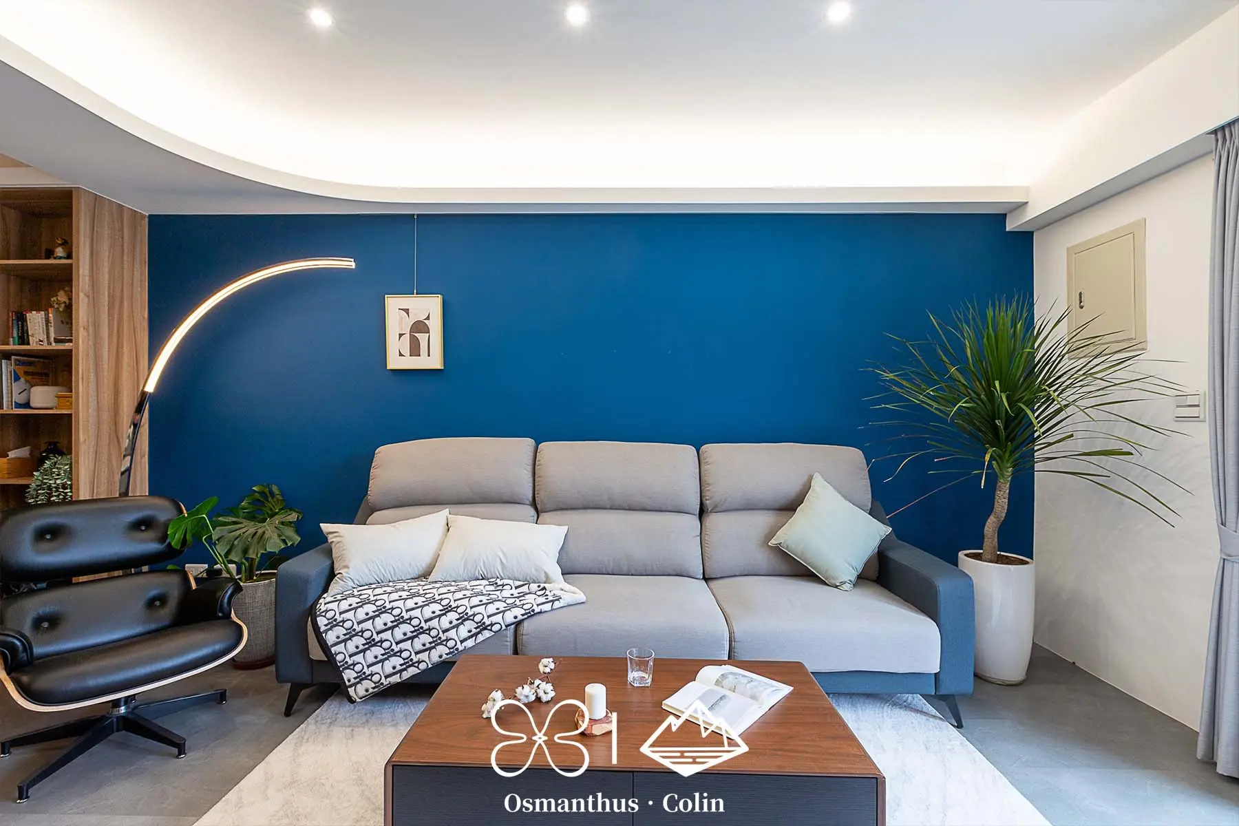 牆面選用樂土塗料,搭配仿水泥質感SPC地板,整體調性內斂而有層次,再以仕紳藍搭配深木色系作為主軸,呼應屋主理性穩重的個性。空間中的垂直燈帶與間接照明不僅勾勒出建築結構,也有引導動線的效果,讓住家多了一種低調的商務感。