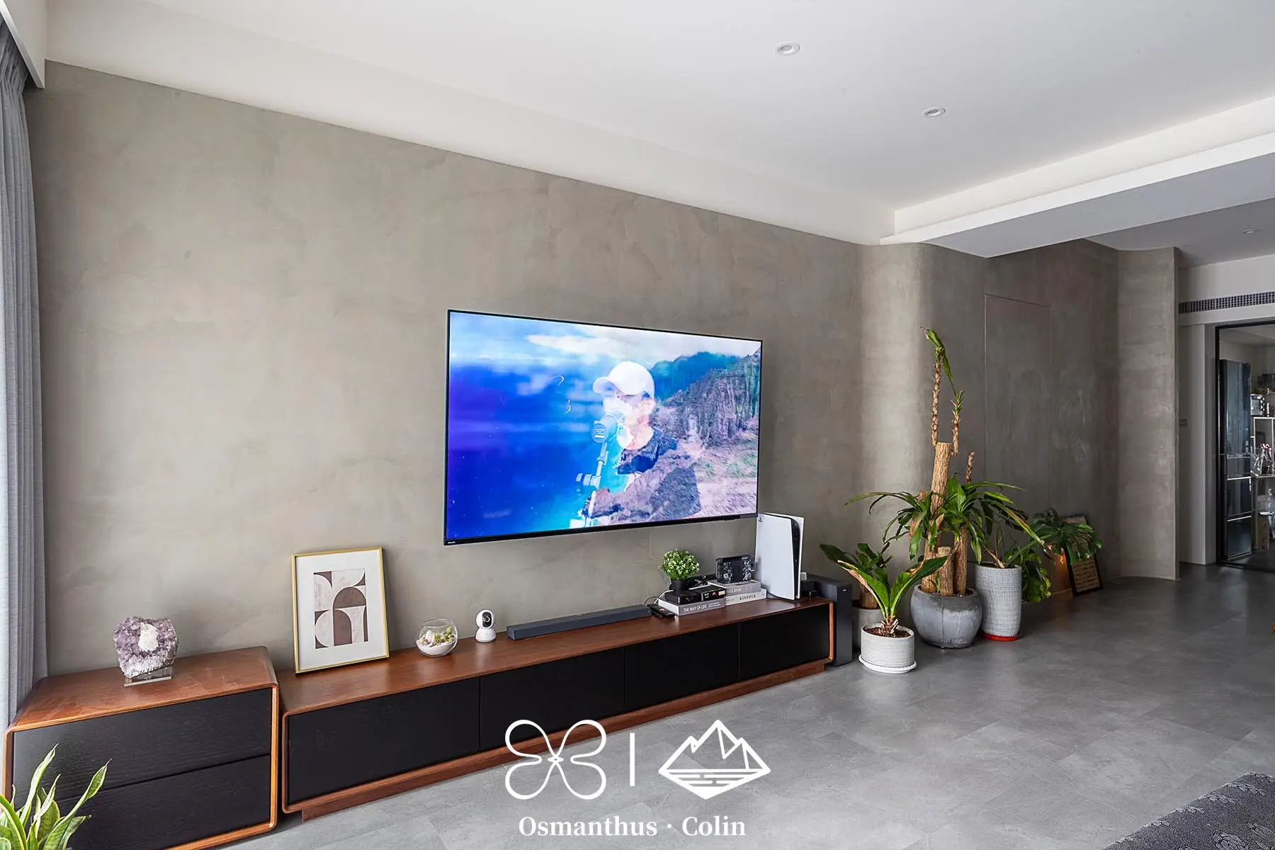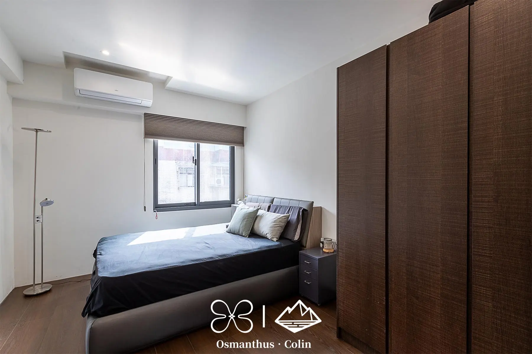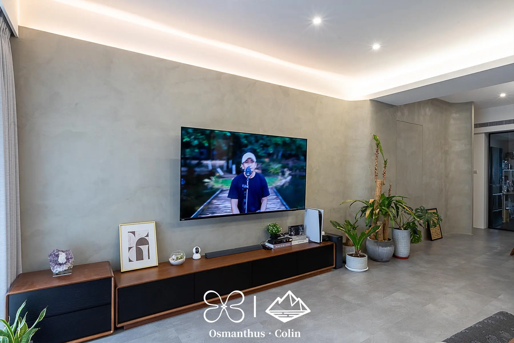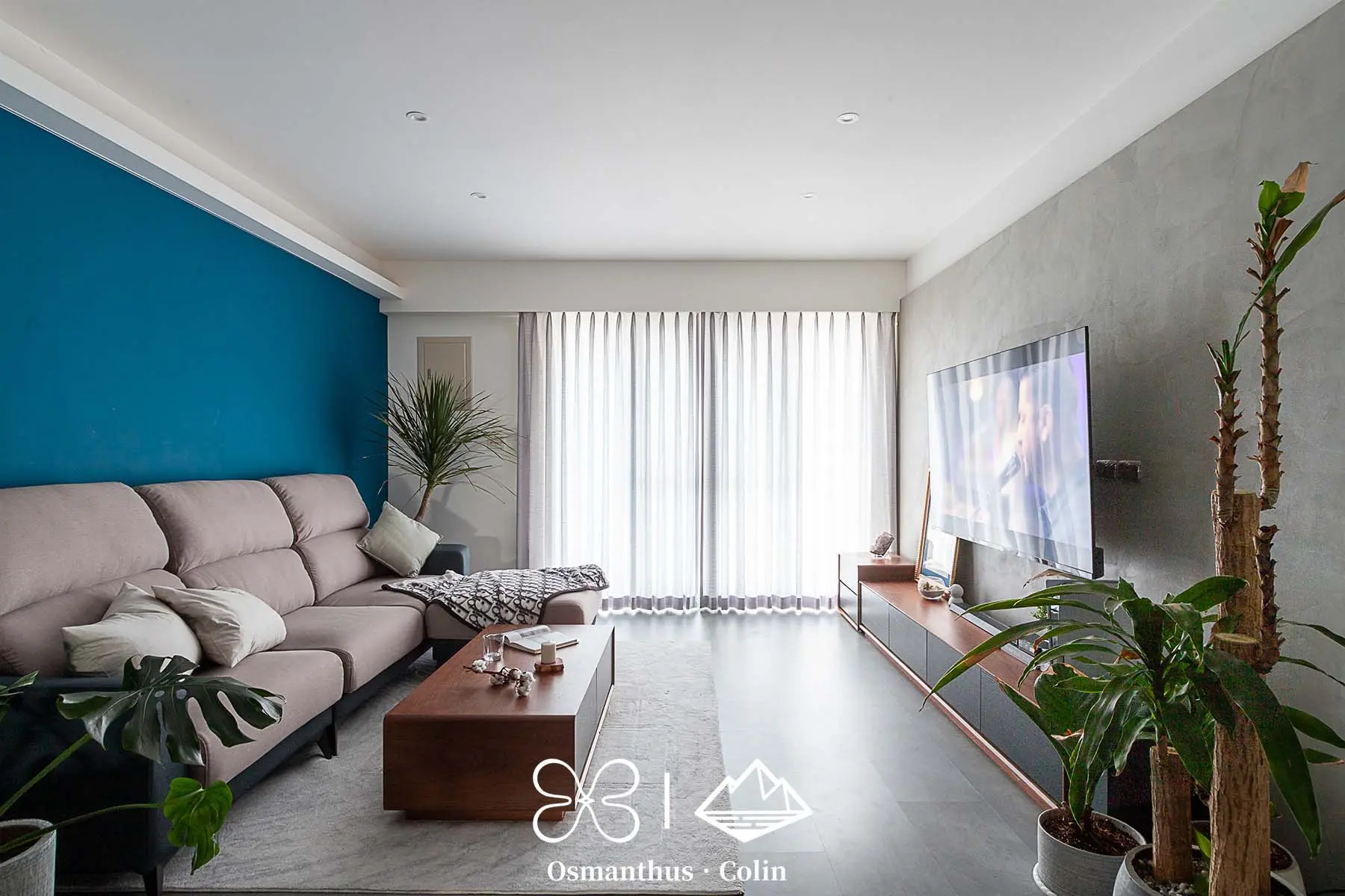 牆面選用樂土塗料,搭配仿水泥質感SPC地板,整體調性內斂而有層次,再以仕紳藍搭配深木色系作為主軸,呼應屋主理性穩重的個性。空間中的垂直燈帶與間接照明不僅勾勒出建築結構,也有引導動線的效果,讓住家多了一種低調的商務感。