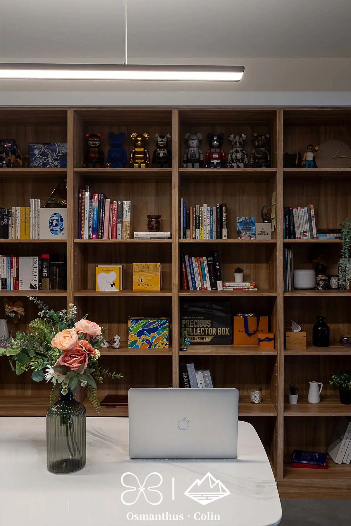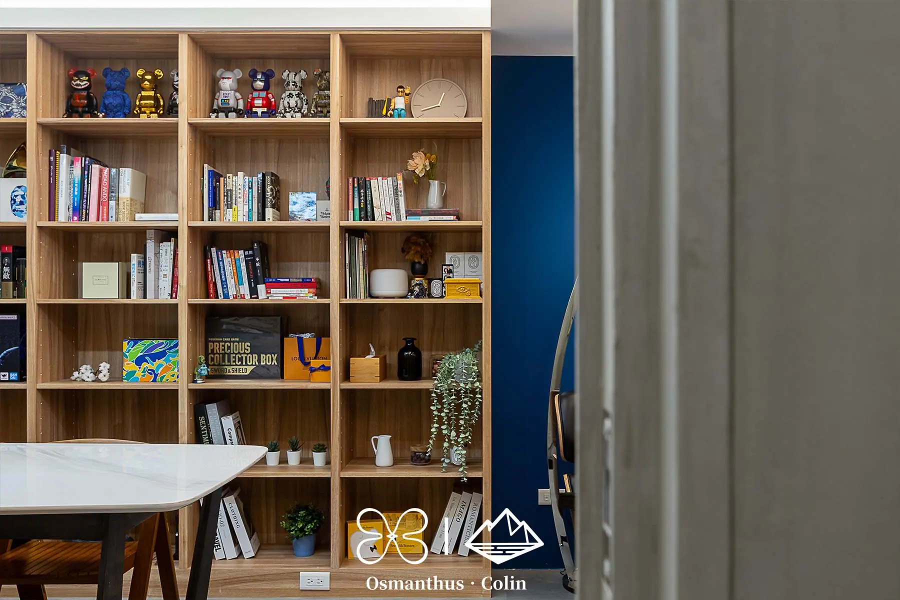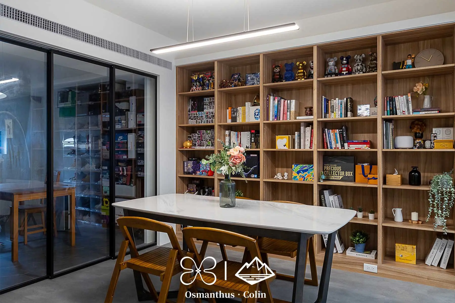 餐廳區不只是餐廳——它是用餐空間,也是簡報桌與會議區。沿牆設置的大面積木質書牆結合收納與展示用途,搭配燈光層次設計,營造出有如選品店般的沉穩質感。
